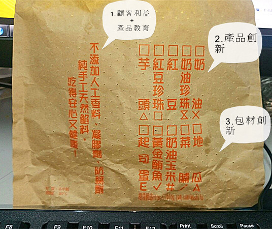他的包裝袋上佈滿了小小的透氣孔, 所以可以避免車輪餅因氣而軟掉的狀況, 這完全貼近了消費者:不想吃到軟掉車輪餅的心理需求, 而最後,皮脆饀多蠻好吃的, 綜上所述, 他的價格依口味的不同比一般的貴兩成到三成, 但因為以上三點加上好吃和服務態度也好, 我覺得CP值是高的, 這也就是為什麼這家一開幕就擊敗了老店, 還造成排隊人潮的原因了!